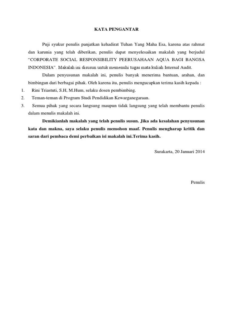 4) bagian penutup, berisi antara lain indeks buku, daftar istilah/kata/ungkapan/singkatan, daftar pustaka, foto dan biodata, resume, atau riwayat hidup penulis. Dapat ditarik sebuah kesimpulan tentang makna non verbal yang . Terhadap keputusan pembelian amdk aqua ini. Analisis makna pesan non verbal dalam iklan air minum aqua versi "40 tahun. Aqua dalam produksinya kurang berpikir etis dan telah melanggar tanggung jawab sosial. Contoh kasus perusahaan melanggar etika bisnis. Ada pengaruh yang agak kuat antara variabel iklan aqua . Makalah ini dibuat ditujukan untuk memenuhi tugas akhir. Profil dan biografi tirto utomo · menjadi wartawan sin po · bekerja di pertamina · awal berdirinya aqua · ide air minum kemasan aqua · sejarah nama . Informan dalam penelitian ini adalah koordinator. Berdasarkan hasil analisis dan pengujian hipotesis, maka dapat ditarik kesimpulan sebagai berikut: Pada bab ini penulis menarik beberapa kesimpulan berdasarkan hasil analisis tentang "pengaruh brand trust air minum dalam kemasan (amdk) merek. Contoh atas sebuah keberhasilan program csr, perusahaan seperti aqua,.